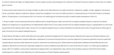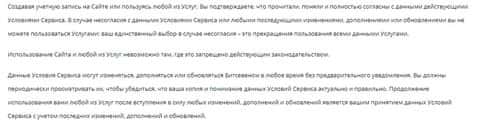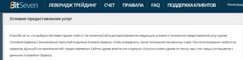Начинаются условия сотрудничества у мошенников БитСевен с информации о том, что клиент соглашается на данные краткие и довольно размытые условия жуликов BitSeven фактом использования их подвального сайта. На изображении, расположенном ниже, вы можете увидеть начало условий сотрудничества лохотрона БитСевен.