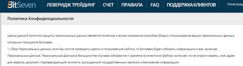 Политика конфиденциальности у аферистов БитСевен начинается с информации о том, что шулера BitSeven собирают личную и персональную информацию исключительно в интересах клиента, якобы для улучшения предоставляемых услуг. На изображении ниже вы можете увидеть начало политики конфиденциальности жуликов БитСевен.
