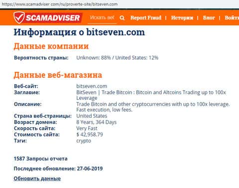 В связи с мошеннической и противозаконной деятельностью лохотрона БитСевен, его руководители предпочитают анонимность дабы избежать ответственности со стороны правоохранительных органов. Аферисты BitSeven даже скрывают реальное местоположение сервера своего сайта, о чем можно узнать с помощью портала scamadviser com.