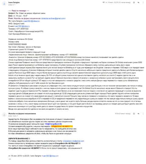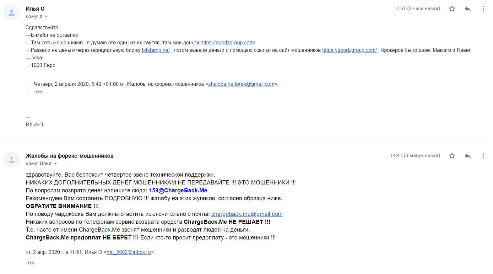 В данной жалобе, жертва кидалова в подробностях рассказала, как она повелась на удочку крипто-аферистов Bitstamp и Гудз Групп, а соответственно потеряла там 1000 евро. Аферисты начинали со звонков менеджеров, а потом аналитики подтасовали сделки и счет был попросту слит. В службе поддержки и сами аналитики больше не отвечали.