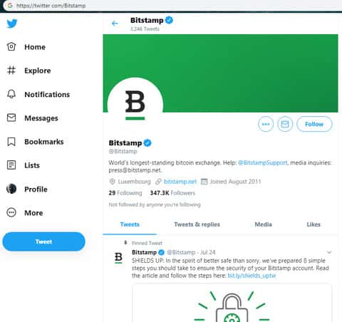 Так же у проходимцев Bitstamp имеется страница в социальной сети Twitter, где лохотрон БитСтамп тотально не пожалел денег и накрутил уже несколько сотен подписчиков, которые все таки не проявляют никакой активности на аккаунте мошенников Bitstamp. На изображении, расположенном ниже, вы можете увидеть страницу лохотрона БитСтамп в социальной сети Твиттер.
