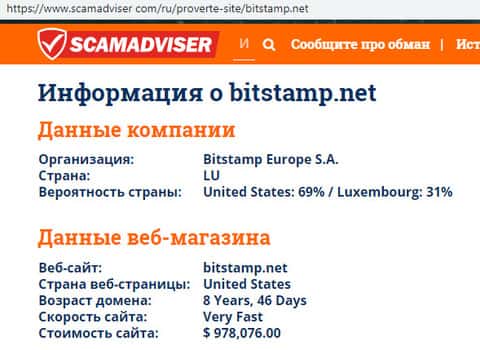 Дабы избежать ответственности со стороны правоохранительных органов в связи с мошеннической и противозаконной деятельностью реальные руководители жуликов Bitstamp предпочитают анонимность. Информацию о самом сайте шулеров БитСтамп можно узнать с помощью портала scamadviser com, который вы можете увидеть на изображении, расположенном ниже.
