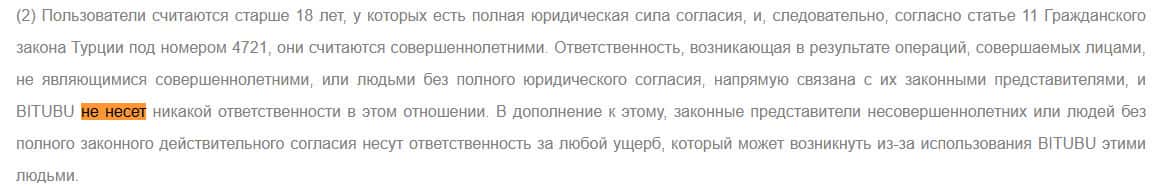 Если несовершеннолетний человек, который не имеет опыта в торговле криптовалютой, захочет зарегиться в Битубу и сольет деньги, то жулики не будут за это отвечать.