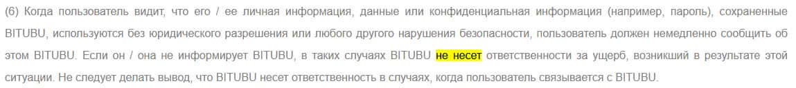 Если по какой-либо причине ваши данные в BITUBU будут утеряны, то жулики снимают с себя любую ответственность и умывают руки. Ваши убытки по их вине - это ваши проблемы.