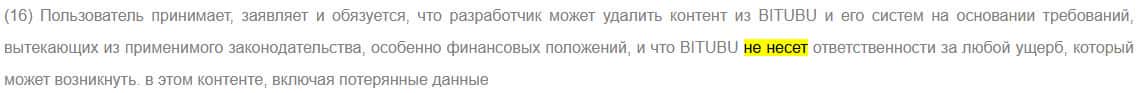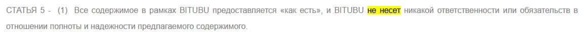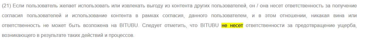 И самое главное - жулики BITUBU снимают с себя ответственность за все содержимое внутри их сайта. Пожалуй, это главная кульминация договора.