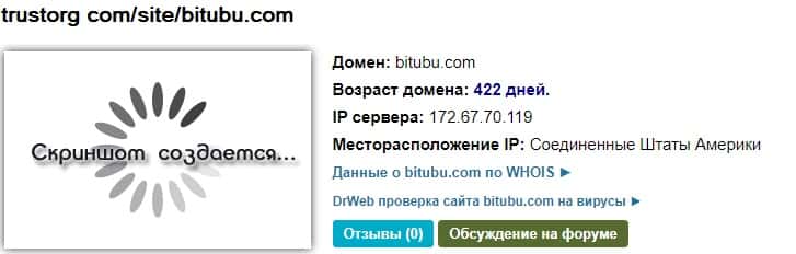 Анализ на сайте ТрастТорг Ком показывает, что домен bitubu com существует 422 дня. За это время они успели обмануть много людей.