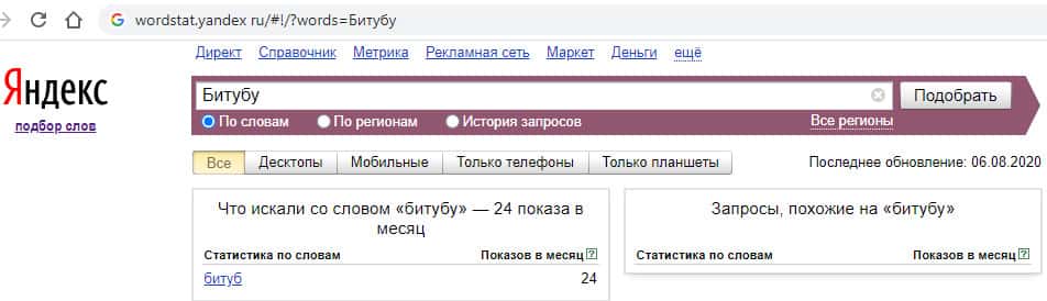 А вот по запросу на русском языке "Битубу" мы видим, что количество показов в месяц уже составляет 24.