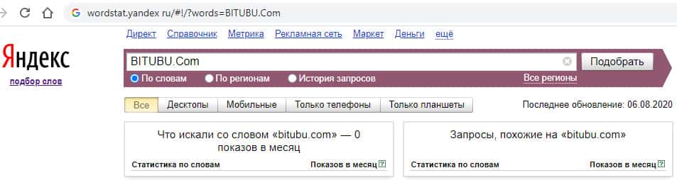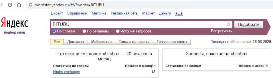 И по запросу на английском языке без пробела и без точки "BITUBU Com" также информацию никто не ищет. Количество показов составляет 0 раз.