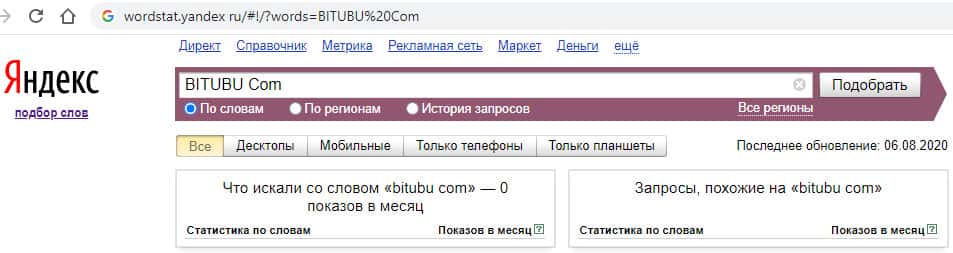 По запросу в Яндекс "BITUBU Com" без точки с пробелом, мы видим точно такую же картину - 0 показов в месяц. По такому запросу инфо о лохотроне не ищут.