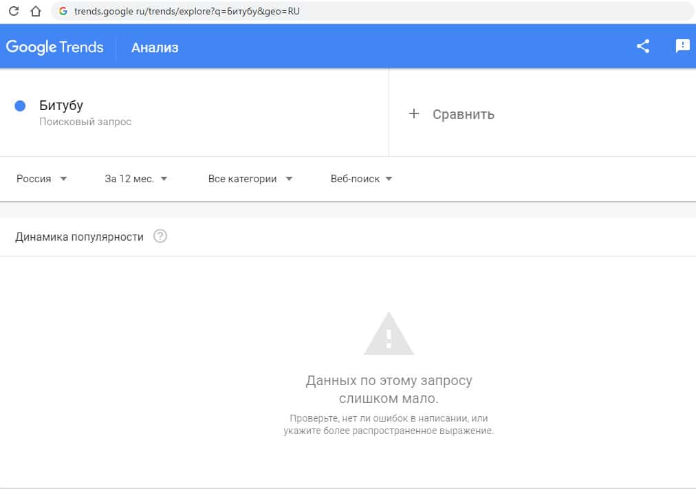 И последний запрос на русском языке "Битубу" тоже не дает никаких результатов. И здесь количество показов составляет 0 раз.