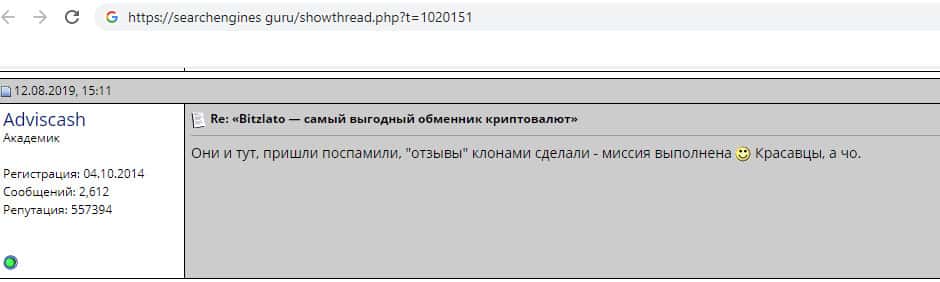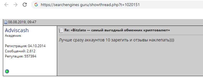 Фальшивые отзывы на главном сайте кидал Битзлато