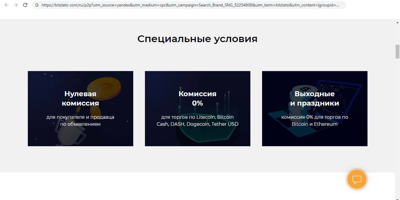 Для того, что бы привлечь внимание к своей финансовой ловушке, компания Bitzlato представила на сайте пункт "Специальные условия" в котором указала, отсутствие комиссий. Так же жулики добавили, что по праздникам так же отсутствует комиссия. Но это всего лишь обман, так как компании нет никакого смысла заниматься своей деятельностью без процентов.