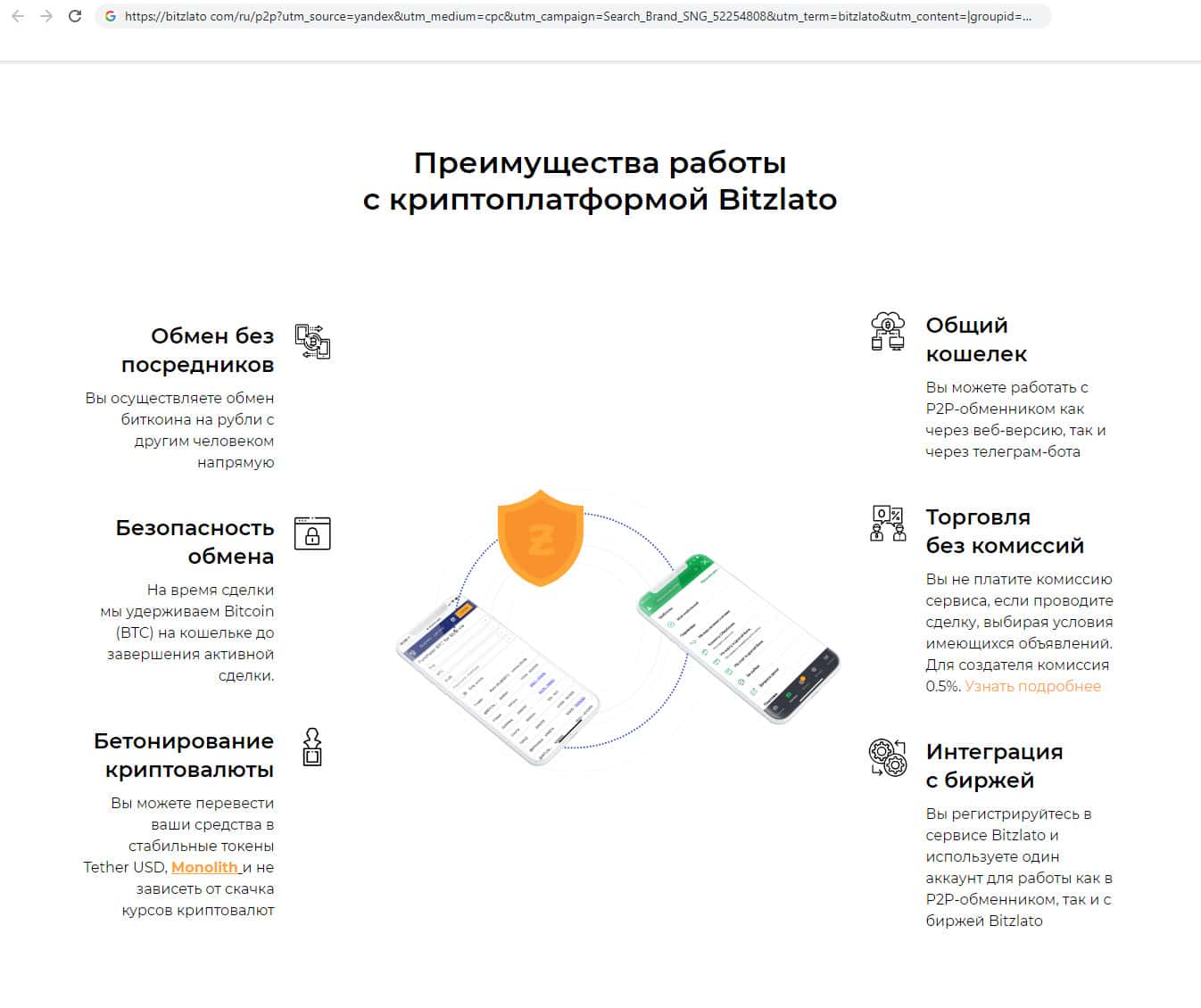 Не забыла компания лохотронщиков указать и преимущества работы с криптоплатформой Bitzlato. Они указывают, что являются обменником без посредников, так же имеют хорошую защиту, торговля без комиссий и имеют общий кошелёк. То есть компания хранит все средства на одном счету, и в любой момент кидалы могут прикрыть компанию и присвоить деньги.