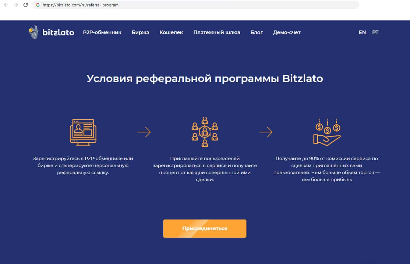 Для того, что бы привлечь больше пользователей, компания разводил Битзлато создала реферальную программу. Когда пользователь регистрирует аккаунт ему приходит его реферальная ссылка, по которой он может пригласить других пользователей и получать проценты от их сделок. На на самом деле это не больше чем реклама и способ привлечения новых клиентов.