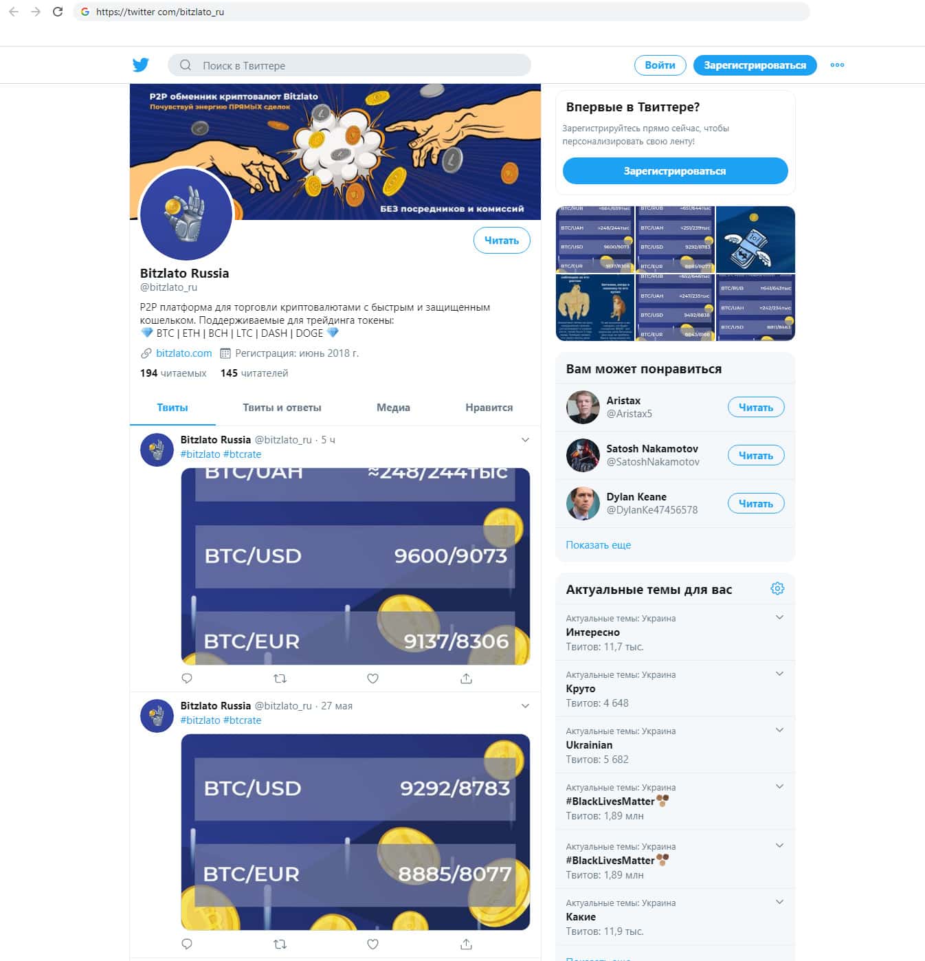 На твитере так же не удалось получить популярность, там разводилы Битзлато набрали всего 145 подписчиков. очень странно что количество подписчиков близко к фейсбуку, возможно это те же люди, которые подписаны на все страницы компании, которым она заплатила за подписку, что бы набрать подписчиков.