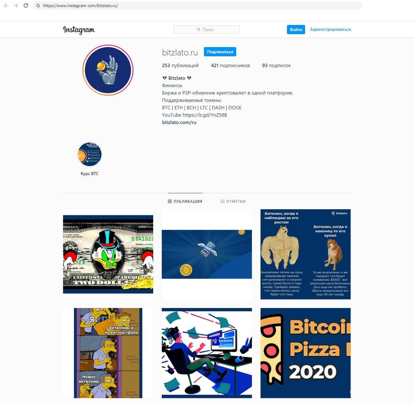 Что бы ещё более разрекламировать компанию, аферисты Bitzlato зарегистрировали свою страницу на самом популярном видеохостинге - инстаграмме. Там аккаунт недоконторы набрал более 400 подписчиков. Это говорит о том, что компания наврала о своей популярности, и возможно о возрасте компании, так как видно из социальных сетей - компания не сильно востребована.