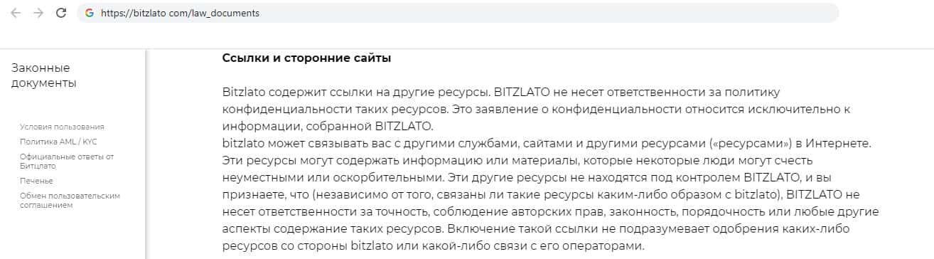 Так же компания лохотронщиков Bitzlatoпредоставила отказ от гарантий. В нём жулики утверждают, что пользователи используют услуги компании на свой страх и риск, а компания не может ничего гарантировать. Вот только информация на главном сайте компании говорит об обратном. Мошенники полностью обезопасили себя этими документами и перебросили всю ответственность на пользователей.