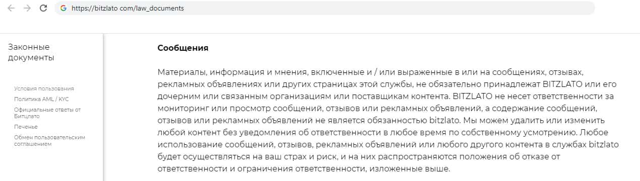 Так же есть пункт о сообщениях. В нём махинаторы Bitzlato указали, что не несут ответственности за сообщения, рекламу, ссылки, или отзывы на форумах, которые написаны от лица компании, так как это может написать кто угодно. Таким образом мошенники отказались от ответственности за всю информацию и все сообщения, что они пишут.