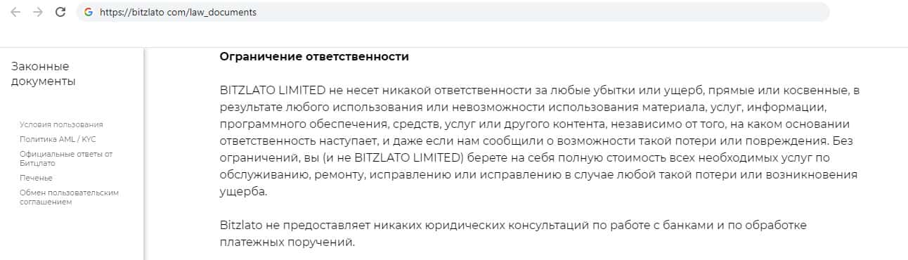 Лохотрон Bitzlato предоставил пользователям документ под названием "ограничение ответственности". В нём компания указала. что не несёт никакой ответственности за любые убытки пользователей, которые те могут понести при сотрудничестве с компанией. Так же пользователь должен на себя взять расходы всех необходимых услуг по обслуживанию, ремонту, и исправлению ущерба.