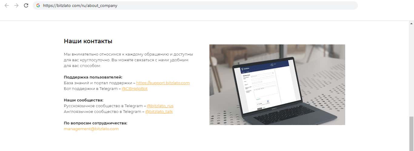 Мошенники на своём сайте предоставили контактные данные компании но почему то очень мало. Жулики представили только адрес электронной почты и адреса ботов в телеграмме. Махинаторы Битзлато не предоставили ни адреса компании, ни номера телефона, ничего... Сотрудники компании не хотят общаться с клиентами, так как компании нужны только деньги. Контактные данные кидал: