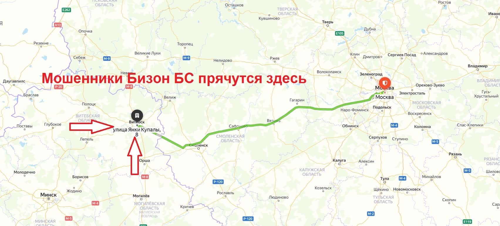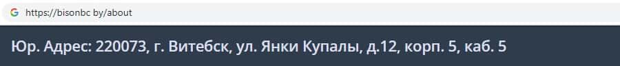 Аферисты Бизон БС на своем дырявом сайте опубликовали информацию юридическом адресе компании, которая находится в городе Витебск, Беларусь.