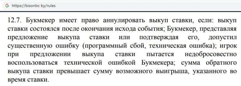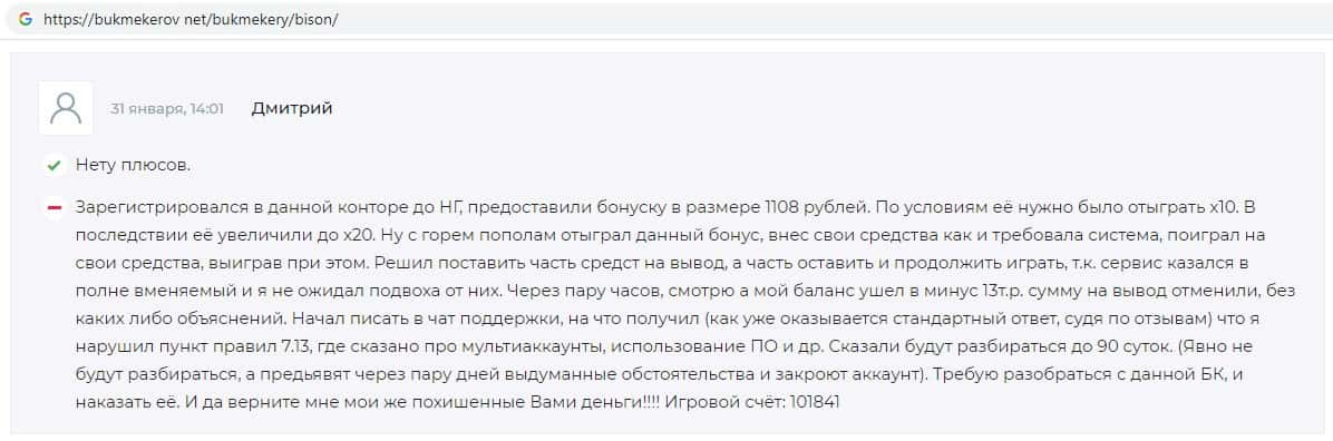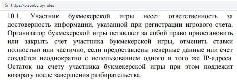 Аферисты Бизон БС не несут никакой ответственности за достоверность предоставленной информации клиенту, а также могут закрыть счет игрока по своему усмотрению.