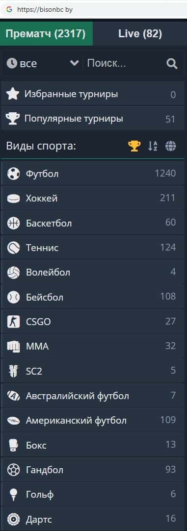 На интернет-портале конторы Бизон БС предоставлен перечень видов спорта, на которые осуществляются ставки, где можно потерять все свои деньги.