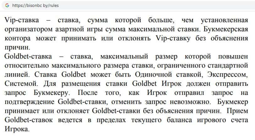Аферисты Бизон БС предлагают такие виды ставок: Vip-ставка, а также Goldbet-ставка, от выбора которых никак не зависит возможность вывести свой выигрыш.