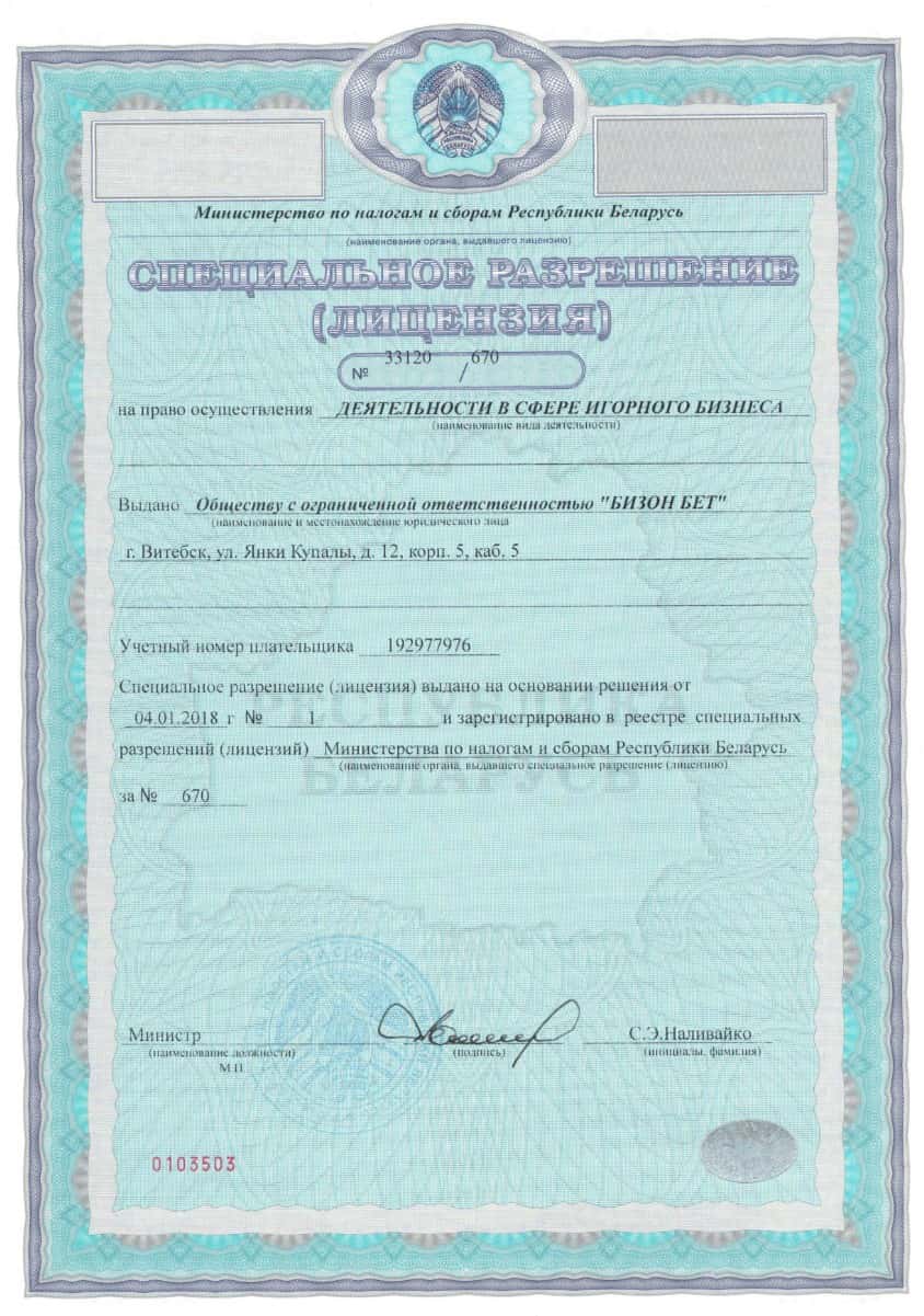 На сайте жуликов BisonBC отыскана информация о лицензии компании, стоит помнить, что такие лицензии никак не защищают граждан Российской Федерации.