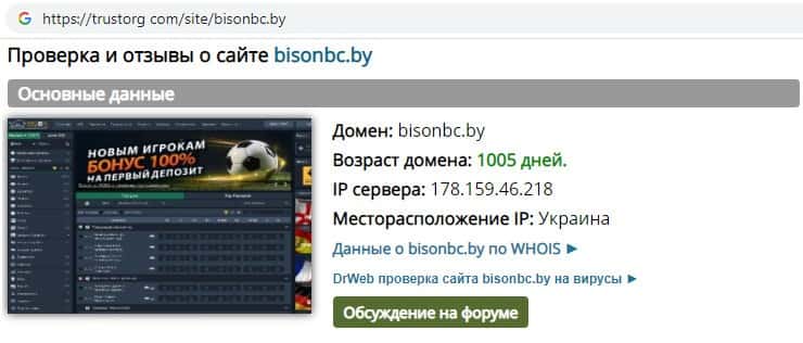 Проверка онлайн-сервиса мошенников Бизон БС на trustorg com показала, что возраст домена к моменту написания статьи составляет 1005 дней, скорее всего домен купленный.