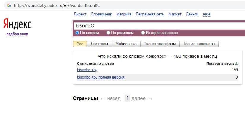 По количеству брендовых запросов названия домена компании без точки "bisonbc by" на wordstat yandex ru данные те же, а именно 180 запросов за месяц.