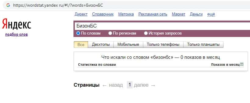 О количестве запросов по бренду названия компании на русском языке без пробела "БизонБС" на Вордстарт Яндекс Ру данные отсутствуют.