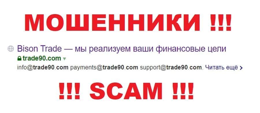 Мы знаем то, что аферисты Бизон Трейд мошенничают в разных государствах, большей частью в отношении говорящих на русском языке игроков, посему, если вдруг Вам случилось посотрудничать с мошенниками Trade90 - Трейд 90, то сообщите Ваш е-майл в форме ниже, и мы с Вами в обязательном порядке выйдем на контакт.