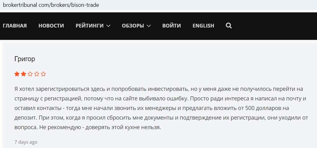 Григор оставил отзыв о конторе Бизон Трейд, где рассказал, как его пытались развести их менеджеры. Сайт выдает ошибку, похоже, что это вообще не рабочий ресурс.