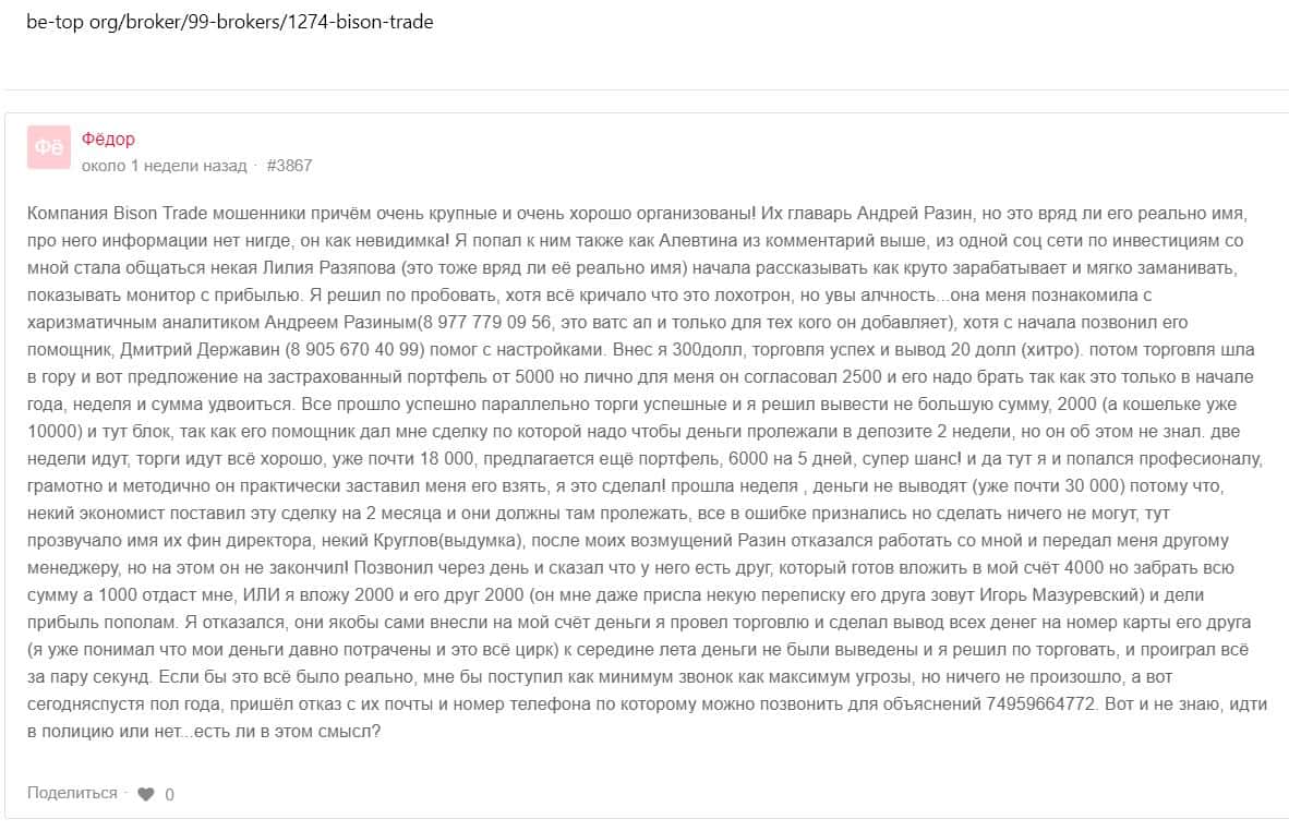 Федор подробно описал,как мошенники из Бизон Трейд кинули его на большую сумму. Он выложил номера телефонов и имена менеджеров этой шулерской организации.