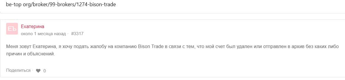 По словам Екатерины, ее счет на платформе брокерской компании Бизон Трейд был удален без объяснения причин. Она хочет подать жалобу на мошенников.