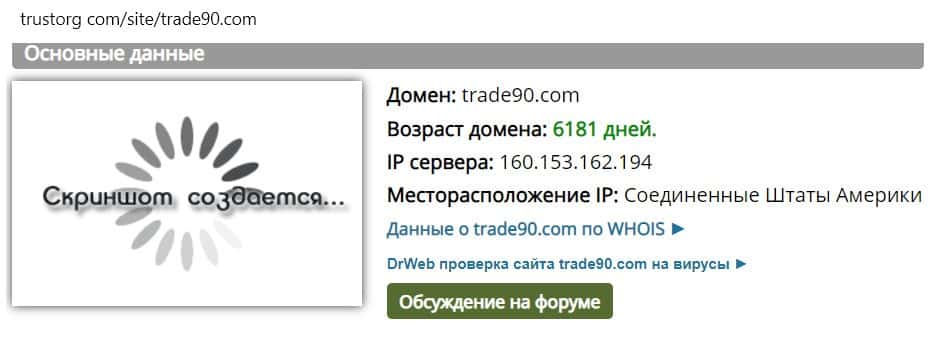 Возраст доменного имени сайта trade90 com составляет 6181 день. Домен купили у другой организации, чтобы создать видимость серьезной конторы с большим стажем.