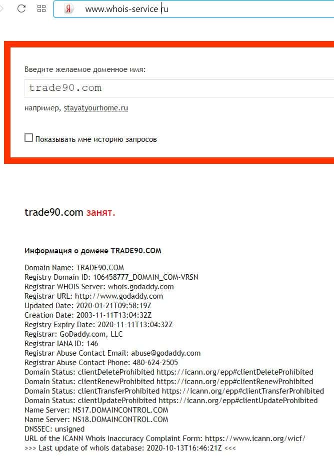 Не удалось выяснить, кто владелец доменного имени trade90 com, потому что мошенники, создавшие сайт, скрывают всю информацию об этом.