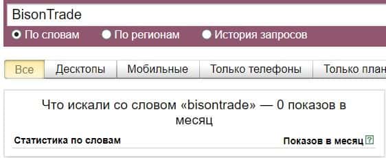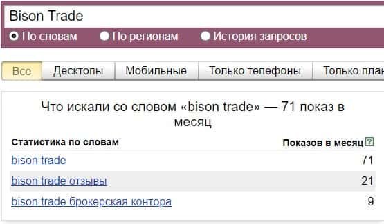 Название мошеннической конторы "BisonTrade", написанное на английском языке, пользователи не искали в системе Яндекс ни одного раза за месяц.