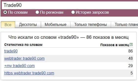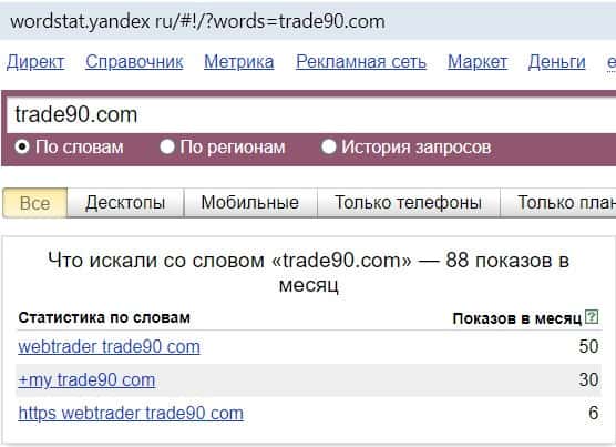 В поисковой системе Яндекс сайт брокерской конторы "trade90.com", вбитый в строку с точкой, пользователи искали 88 раз за месяц.