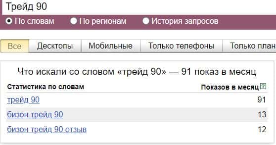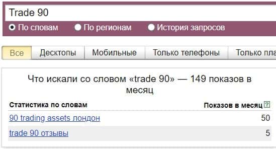 Люди пытались найти данную контору в системе Яндекс Вордстат по названию "Trade90" на английском языке 86 раз в месяц.