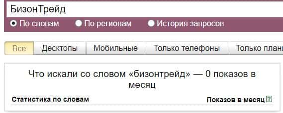 Название бренда на русском языке без пробела "БизонТрейд", пользователи также совсем не искали в системе Яндекс.