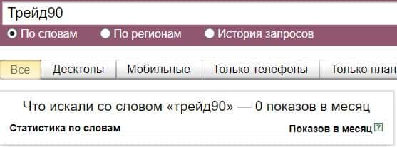 Если ввести в поисковик Яндекс название бренда "Трейд90" без пробела, на русском языке, то получим такой результат: 0 показов.