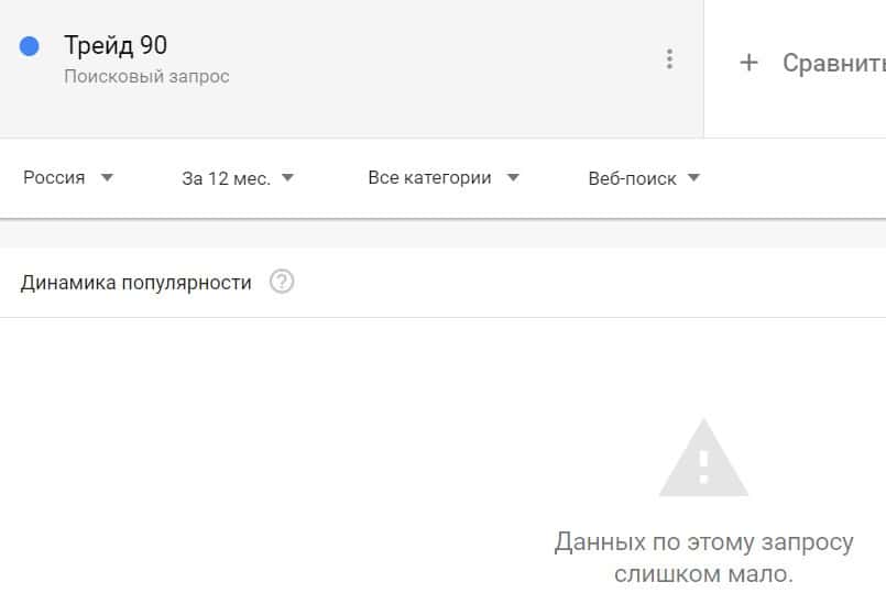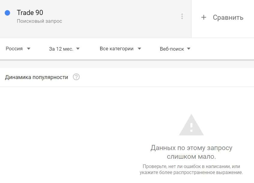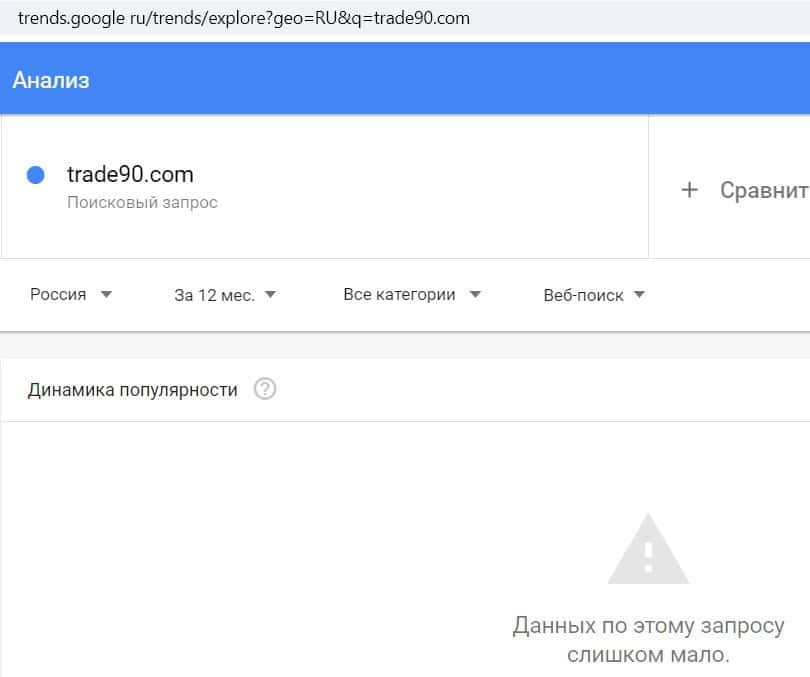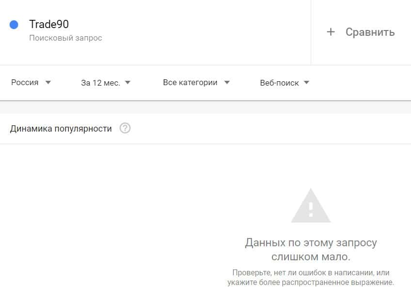 По количеству запросов на то же названию конторы, но с пробелом "Трейд 90", в поисковой системе Гугл Тренд также нет данных.