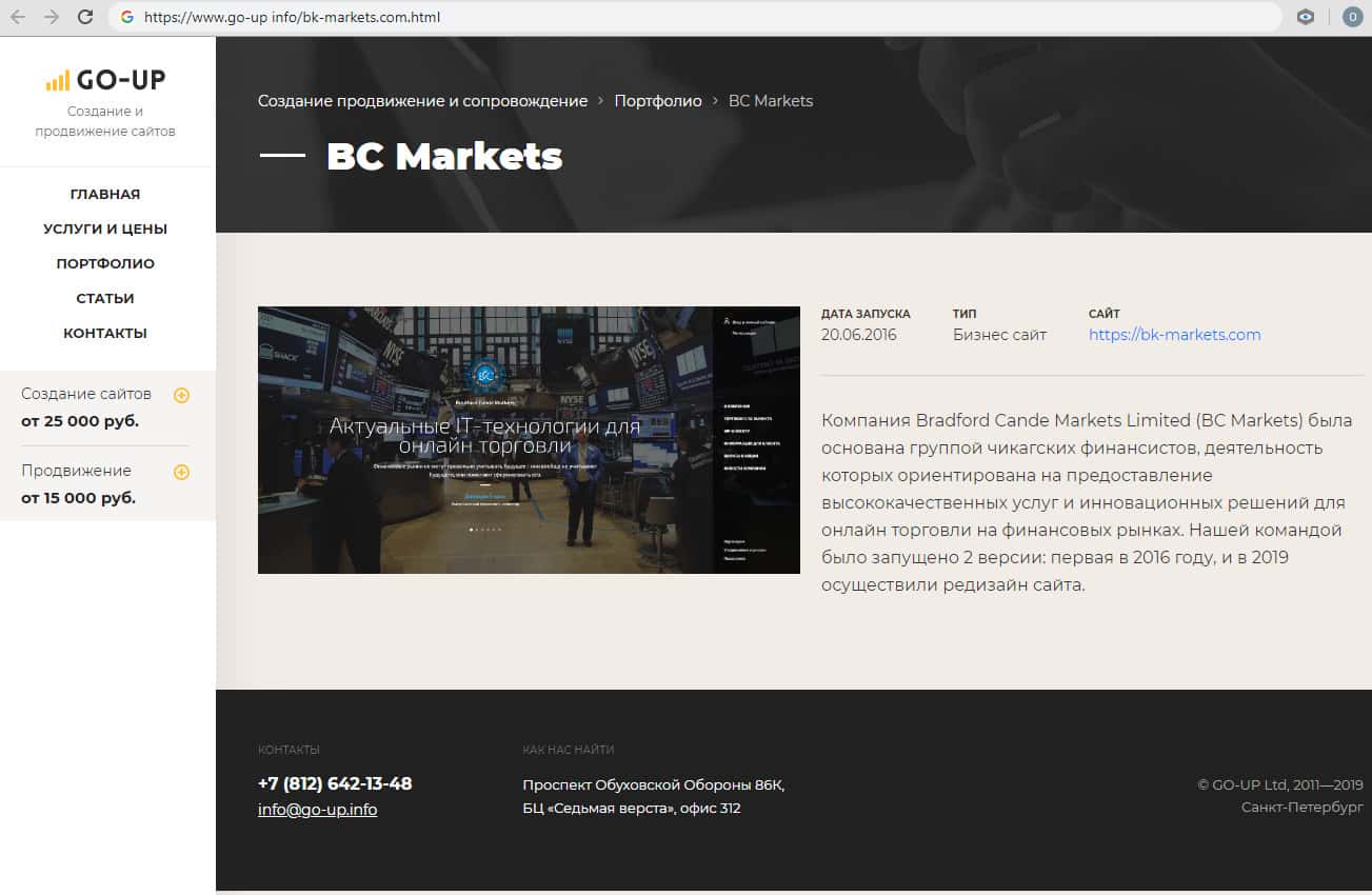 На портале компании go-up ltd. из Санкт-Петербурга расположено портфолио их работы: сайта БК Маркетс. Так же указано, что данный сайт был ими изготовлен 2016 году, а затем в 2019 году был проведен редизайн сайта. Интересно получается: чикагские финансисты заказывают у Российской компании разработку сайта с русским интерфейсом для международной компании, расположенной на Сейшельских островах!