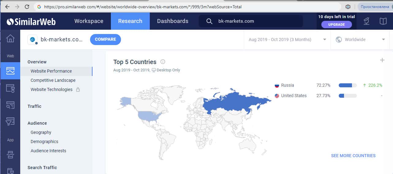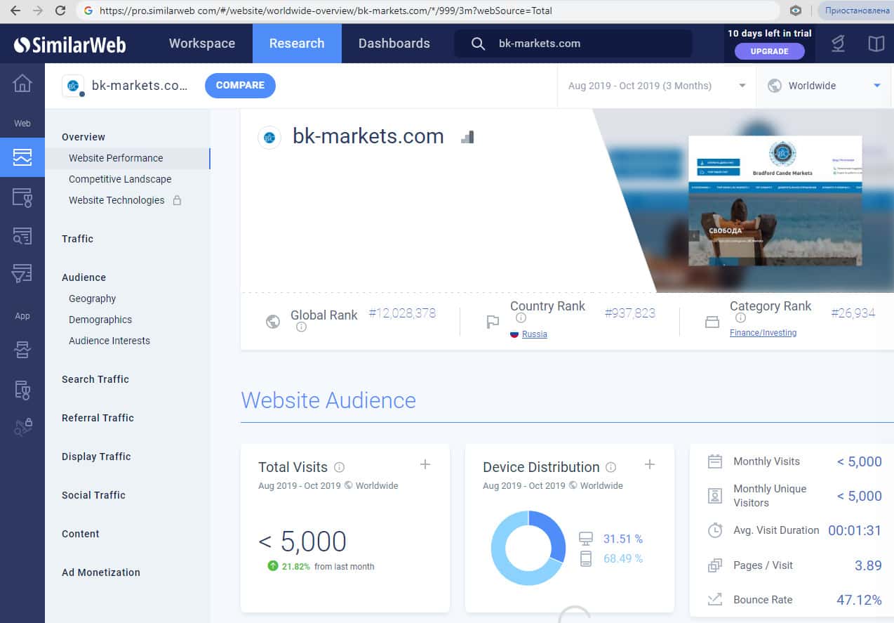 Также познавательна информация с портала similarweb com. Там, правда, отображена информация до проведения редизайна портала, но интересна сама статистика посещений: ежемесячно портал БК Маркетс посещает менее пяти тысяч пользователей, треть из них выходят с ПК, остальные с мобильных устройств.