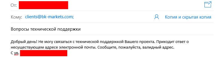 Телефонных номеров, как это водится преимущественно Лондонских, не указано. Значит, не всё так плохо. Но есть и небольшой конфуз: по непонятным причинам, адрес электронной почты отдела технической поддержки брокера БК Маркетс оказался фальшивым.