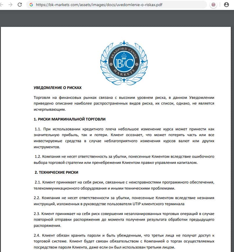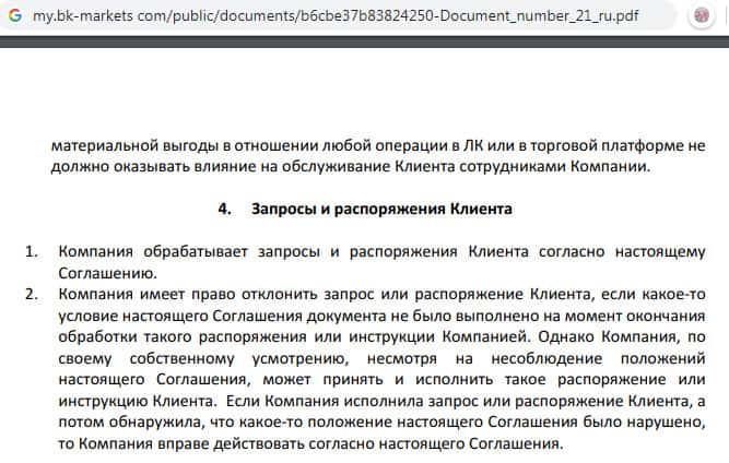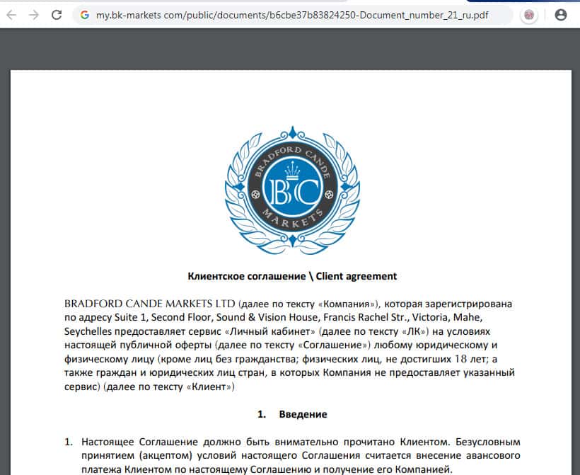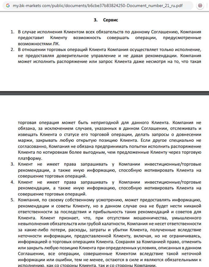 Клиентское соглашение неформально подписывает каждый клиент при регистрации. И если всё-таки Вы решились на сотрудничество с брокером, то было бы не лишним изучить это соглашение. Во многих его пунктах содержится довольно таки любопытная информация. Так в первых его строках говорится, что компания БК Маркется предоставляет клиенту лишь услугу личный кабинет, ни о каких брокерских услугах речи не идёт.