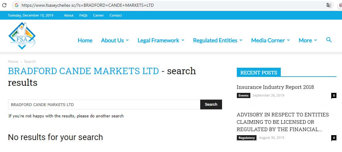 - Отсутствие сведений о Bradford Cande Markets у финансового регулятора Сейшельских островов