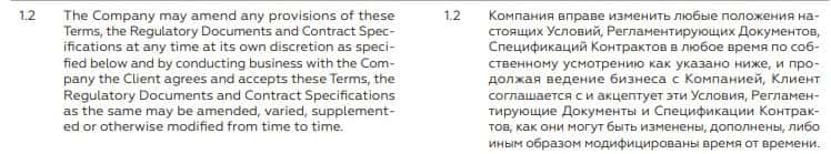 В пункте 1.2. соглашения говорится, что BCS Markets вправе изменить договор в любое время по собственному усмотрению, не предупредив заранее об этом форекс пользователей.